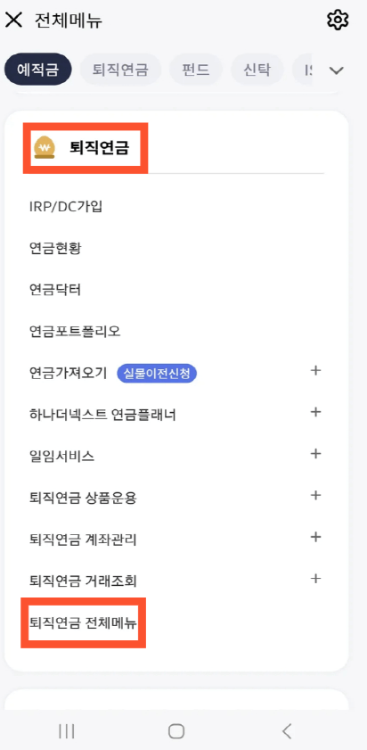 - 퇴직연금 메뉴에서 퇴직연금 전체메뉴를 선택하세요.