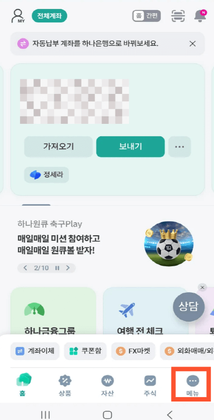 - 하나원큐앱을 실행 후 우측하단의 메뉴를 선택하세요.